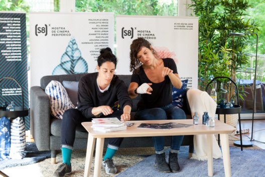 La entrevista con Prismáticas, Pilar Monsell y Aitziber Olaskoaga, empieza con una performance de la mímica de la máquina de coser y el proyector, como parte del Principio Máquina de Coser, en la que se establece un paralelismo entre los trabajos fabriles y la labor invisible (en gran parte de mujeres), de las grandes industrias textiles y del cine.