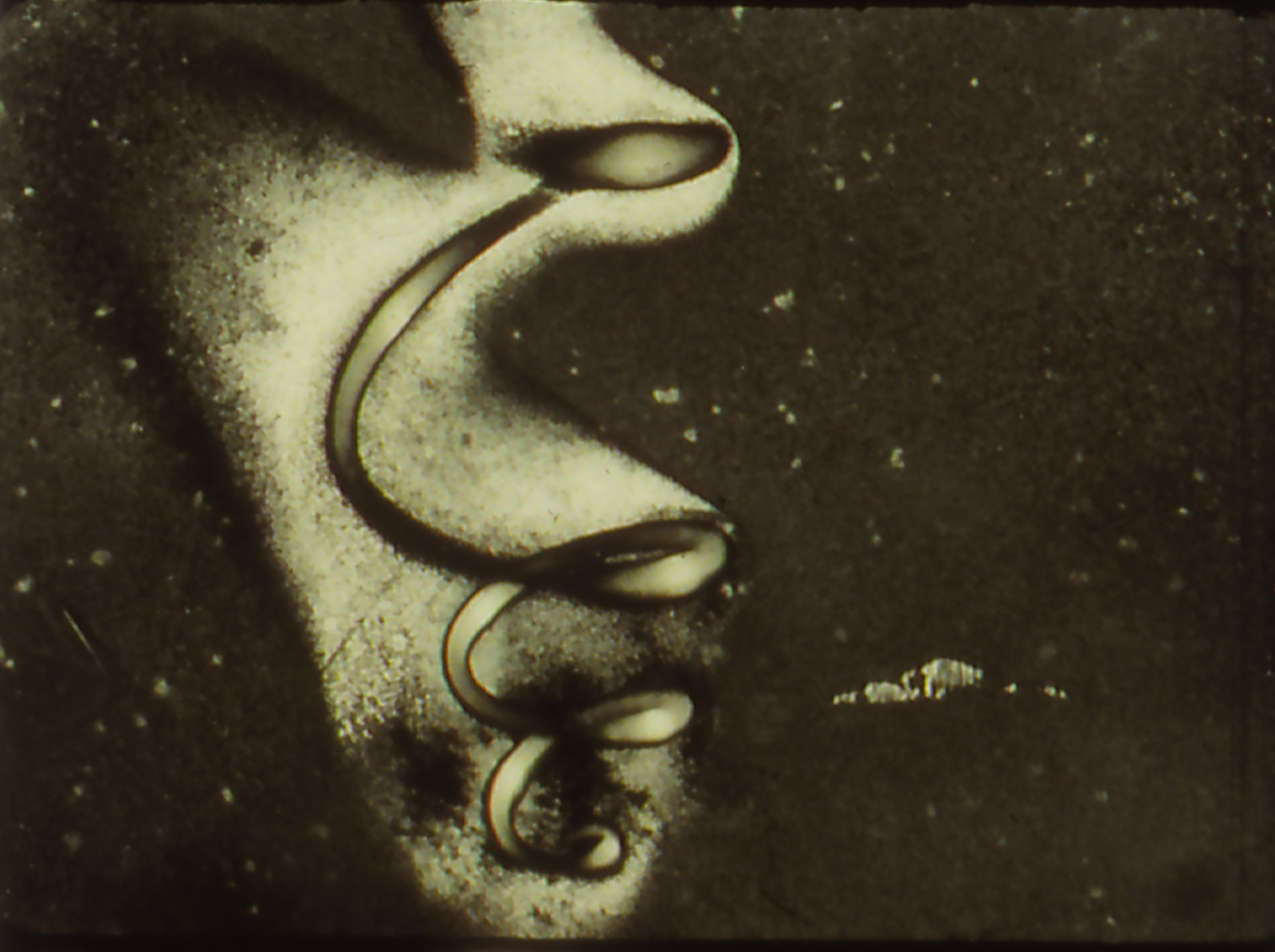 La inspiración de The Tears of a Mudlark vino de una fotografía tomada entre los años 30 y 40 de dos biólogas que habían descubierto los restos de una plaga de saltamontes congelados en un glaciar. Encontré la foto en la colección fotográfica de la Biblioteca Pública de Los Angeles, junto con otras fotos antiguas de LA. Llevaba un tiempo pensando en hacer una pieza sobre los estratos —las capas que se van depositando unas sobre otras— quizás porque eso mismo era lo que yo estaba haciendo fotoquímicamente en muchas de mis películas. Entonces empecé a pensar en la extracción de petróleo en LA y en su legado de contaminación en relación con la historia que quería contar, que trataba también sobre exhumar una ilusión y tratar de sacarla a la luz con la linterna mágica al mismo tiempo. (C.P.)