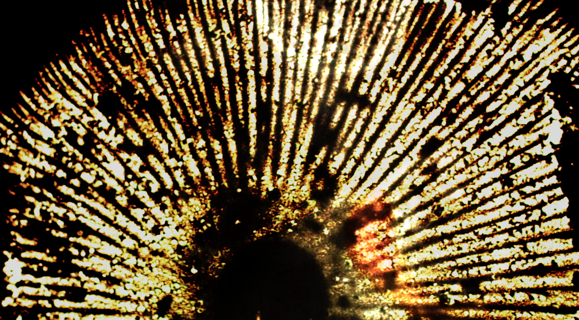 Una película hecha a partir de las esporas de hongos que fueron creciendo en una película de 35mm durante una década, que luego fueron copiadas en película en blanco y negro de alto contraste que posteriormente fue coloreada a mano. Una impresión cósmica, una explosión de partículas relucientes y círculos estriados. Hecha durante una residencia en MQ21 en Viena. Música de Stephen Voglsinger, grabada en vivo en la Sternstudio Gallery, en Viena, durante una film performance en abril de 2016. (Mike Hoolboom) - FILM ON FILM